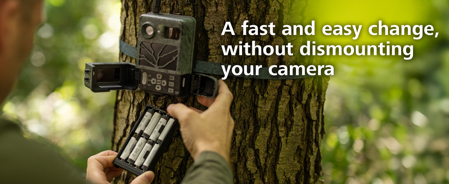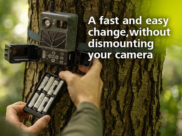 Prepare the additional battery magazine at home by loading it with eight fully charged rechargeable batteries or fresh batteries. On-site, simply remove the empty battery magazine from your trail camera and replace it with the prepared one. This saves valuable time and eliminates the need to change individual batteries in the field – a particularly practical advantage for long deployments in nature.