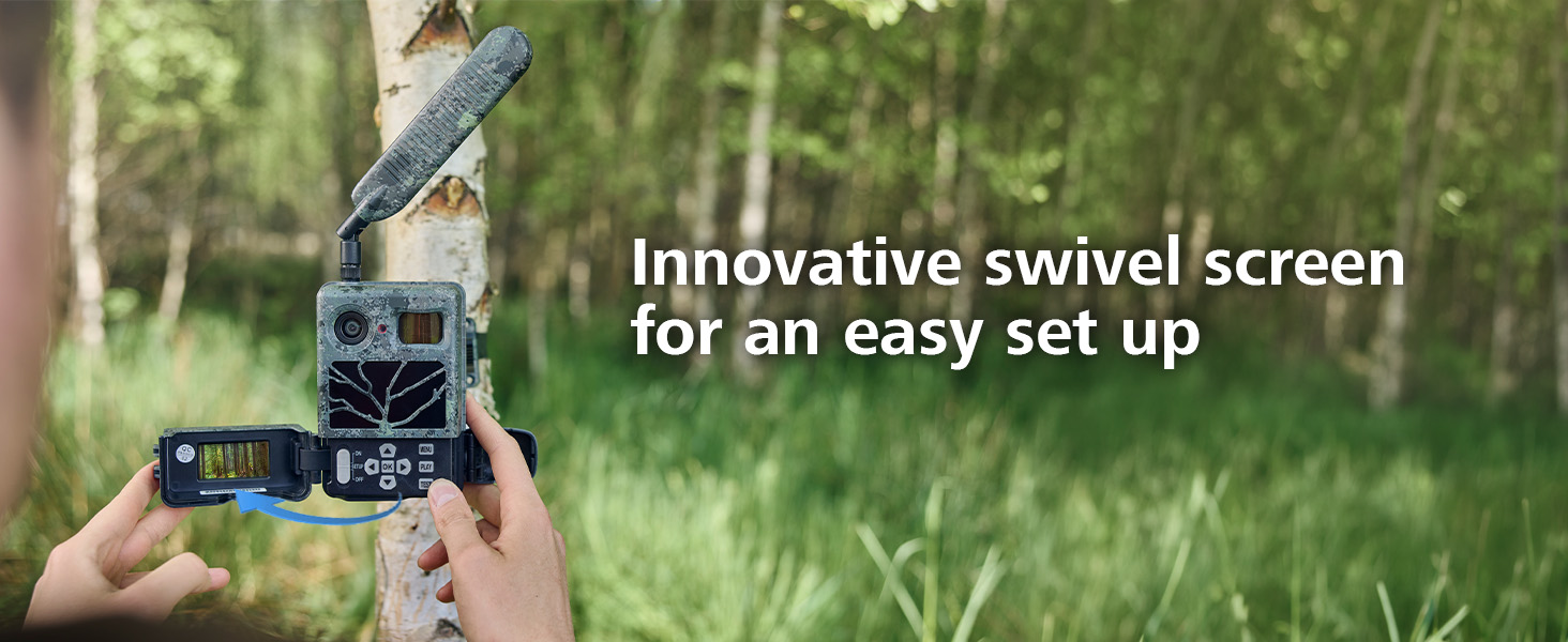 Setting up the camera is particularly convenient. Using the live image display on the swivelling 1.9-inch screen, you can see the frame directly and position the camera optimally. The practical TEST button also simplifies installation. With just one press, a test photo is taken and sent directly to your smartphone, allowing you to quickly check the mobile connection.