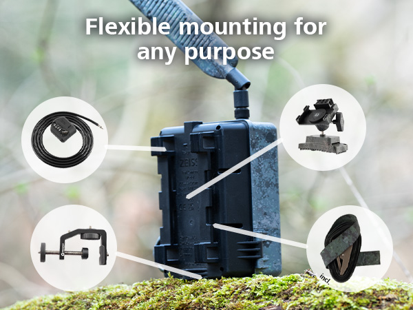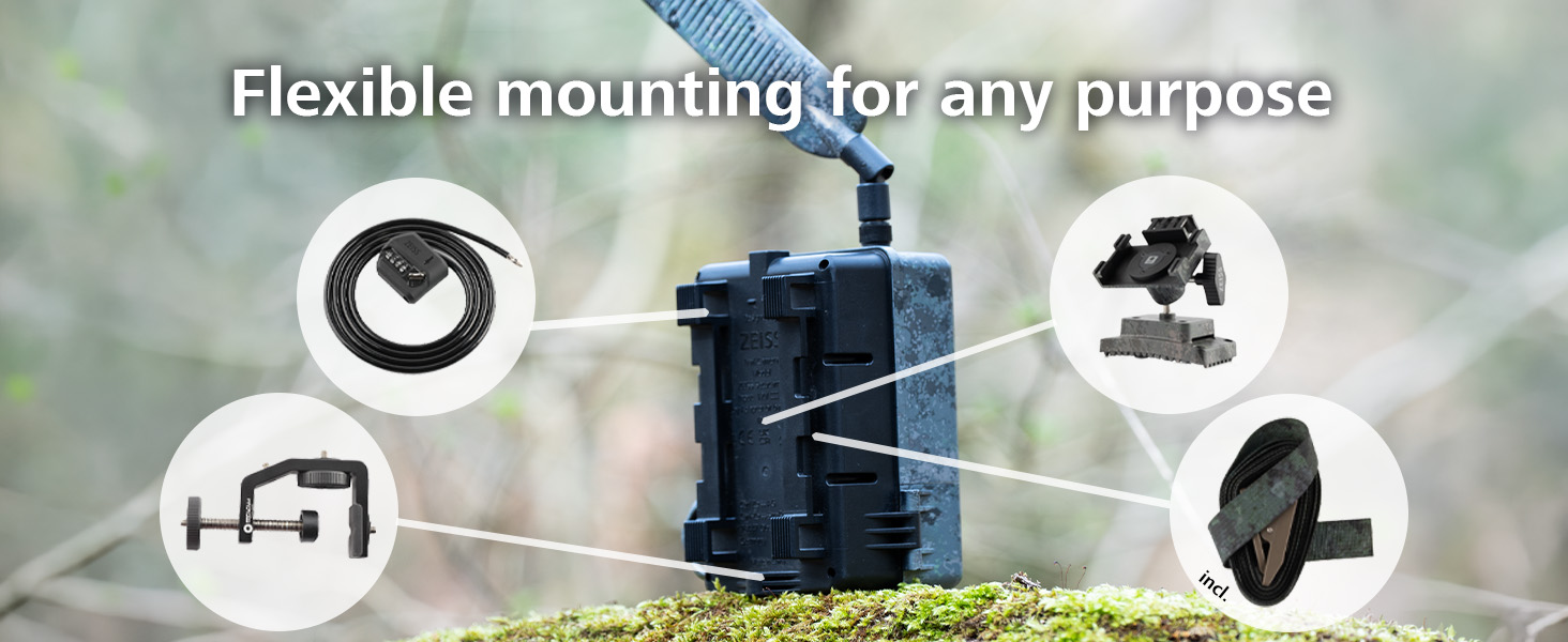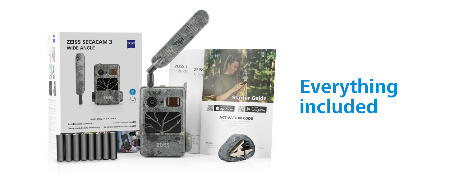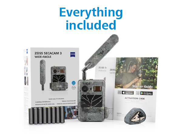 The LTE-enabled ZEISS Secacam 3 Wide-Angle trail camera is delivered ready for immediate use. The package includes: ZEISS Secacam 3 Wide-Angle trail camera with integrated 32 GB storage, 8 × AA batteries, Multi-roaming SIM card (pre-installed), 4G antenna, Mounting strap, english user manual, Quick-start guide with activation code. The date and time are already set, so you can start using the camera immediately after unpacking it.
