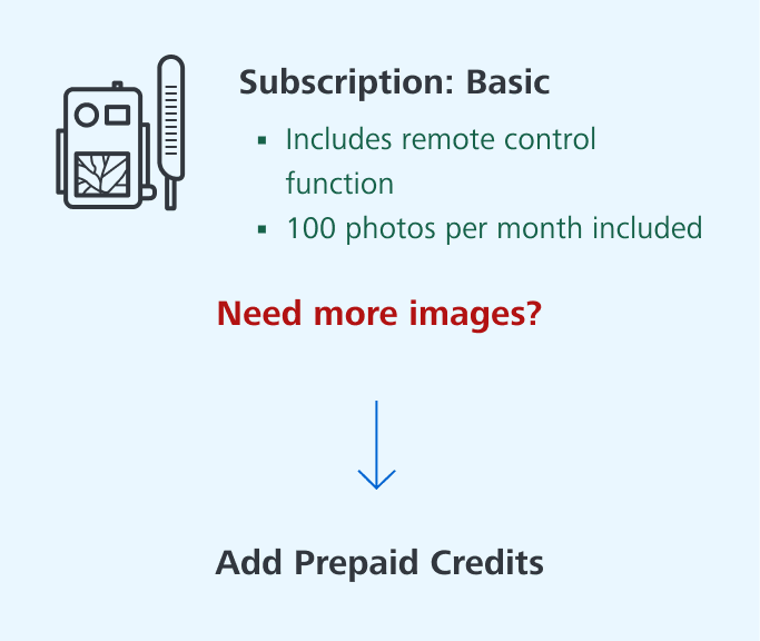With ZEISS Secacam, you decide how you want to use your trail camera - either with Prepaid Credits or with a Subscription that includes additional features. Both options give you full control. You choose what best fits your needs.